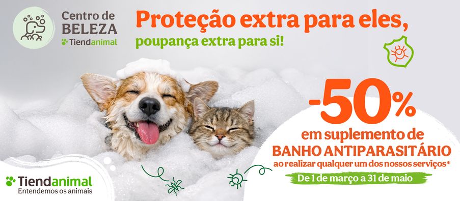 Os seus patudos merecem cuidados completos — e agora o banho antiparasitário fica ainda melhor com -50% em suplemento, ao realizar qualquer um dos nossos serviços.